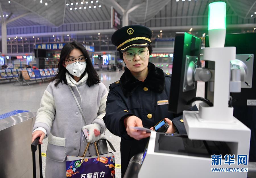 1月23日凌晨,西安北站客运员张珂(右)协助旅客检票进站。 新华社记者 张博文 摄