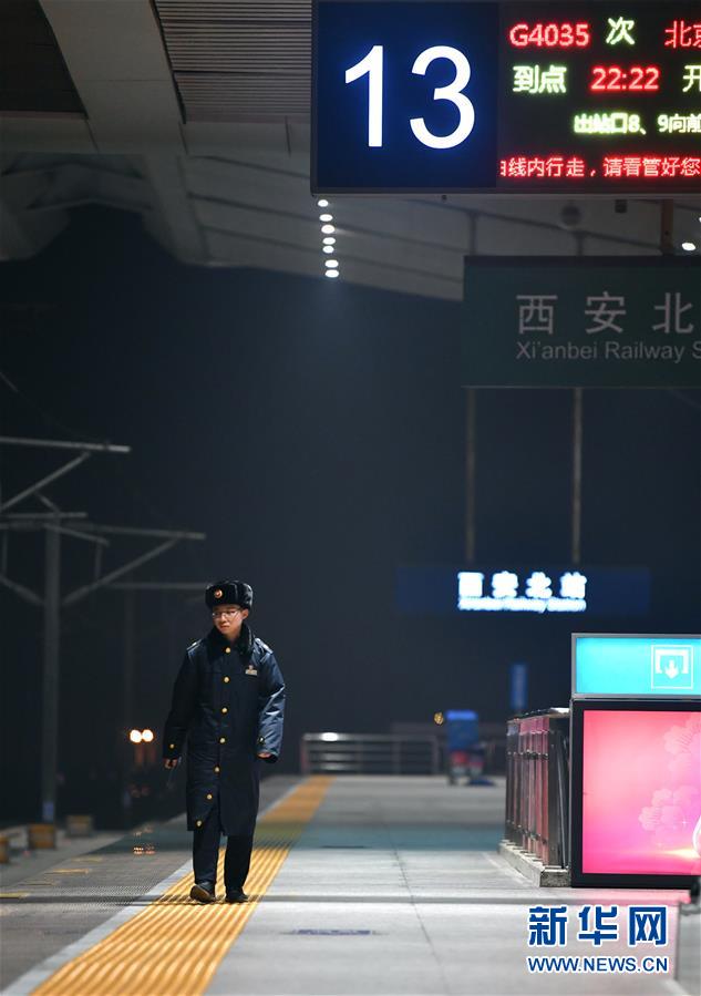 1月22日,西安北站客运员柯浩在站台巡视。 新华社记者 张博文 摄