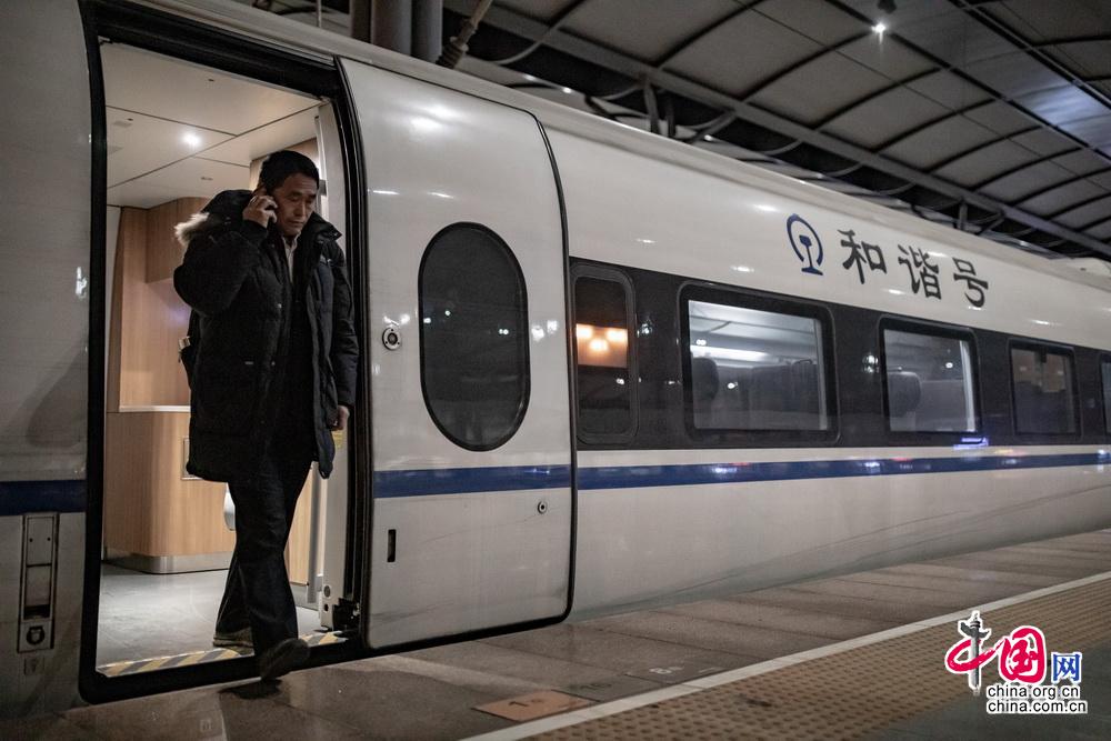 当日早上5点45分左右,确认车到达天津西站,老曹迅速的收拾好随身设备离开车厢,同时立即拿出工作手机与指挥中心联系,汇报线路情况。此时距离当日的京沪高铁首班车开行只有半个小时左右的时间了。中国网记者 郑亮摄