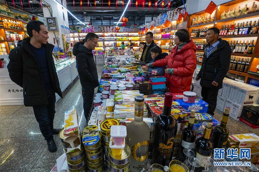 游客在塔城巴克图口岸丝路文化商品城一家店铺里选购产自中亚地区的商品(1月21日摄)。新华社记者 赵戈 摄
