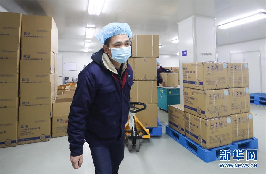 1月23日,在浙江省德清县湖州莫干山高新技术产业开发区一口罩公司生产车间,工作人员在拉运成箱的口罩。新华社发(王正摄)