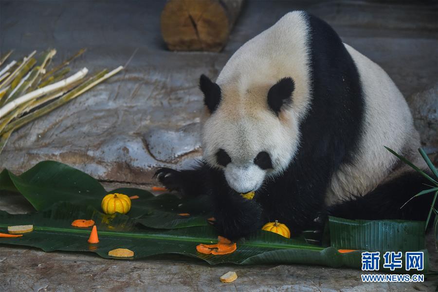 1月23日,大熊猫“贡贡”在吃“饺子”。 当日,位于海口的海南热带野生动植物园为园内大熊猫“贡贡”“舜舜”准备了“饺子”。这些“饺子”由工作人员用玉米粉、黄豆粉、面粉、钙粉和鸡蛋混合制成饺子状,再蒸熟而成。此外,该园还为“贡贡”“舜舜”准备了苹果、甘蔗和胡萝卜等食物,并在熊猫馆内挂起了红灯笼和福字,与“国宝”们共迎春节。 新华社发(蒲晓旭 摄)