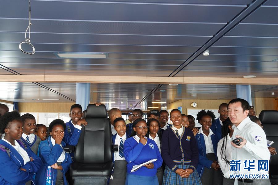 1月22日,船上驾驶员向开普敦中学生介绍“雪龙2”号(摄于1月22日)。 新华社记者 刘诗平 摄