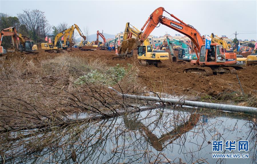 1月24日,在武汉蔡甸区知音湖武汉职工疗养院附近,大型机械加紧施工(无人机照片)。新华社记者 肖艺九 摄