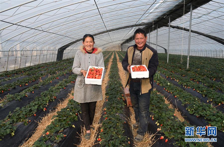 1月23日,安丰东(右)和王世梅夫妇在草莓大棚里展示刚刚采摘的草莓。 新华社记者王凯摄