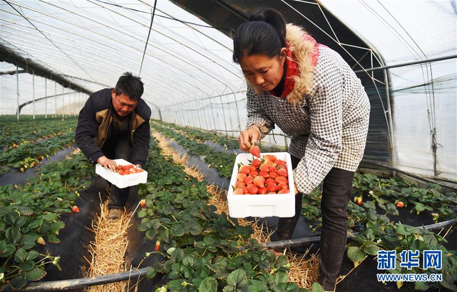 1月23日,安丰东(左)和王世梅夫妇在草莓大棚里摘草莓。 新华社记者王凯摄