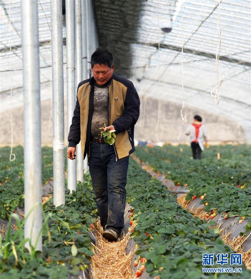 1月23日,安丰东在草莓大棚里做田间管理。 新华社记者王凯摄