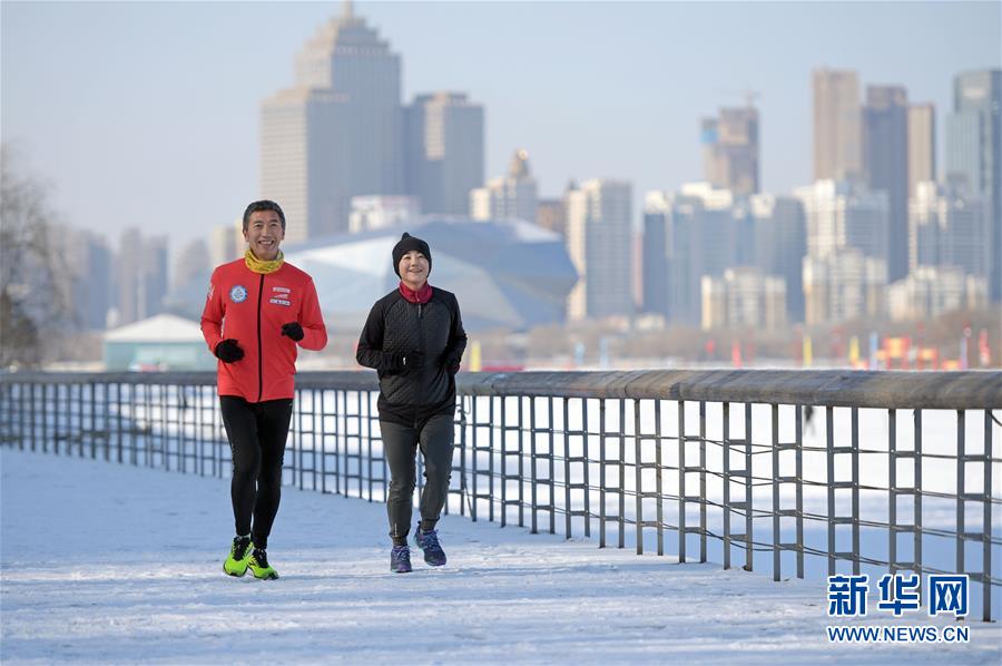 1月20日,在沈阳浑河岸边,张天杨(左)和陈玲跑步,这是夫妇两人共同的爱好。新华社记者 杨青 摄