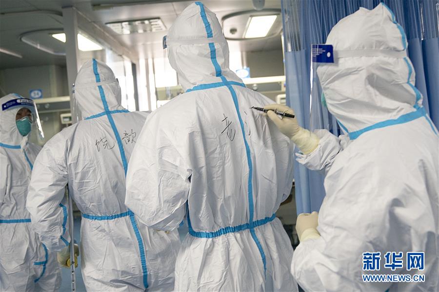 1月24日,在武汉大学中南医院重症隔离病房,医护人员在隔离服上写下名字,方便辨认。 新华社记者 熊琦 摄