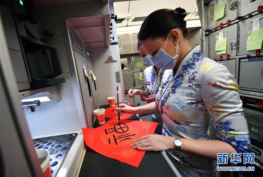 1月24日,海南航空罗马尼亚籍空姐劳拉在机舱内写“福”字。这是她在中国度过的第四个春节。 当日是除夕,在海口飞往北京的海南航空HU7181航班上,坚守工作岗位的机组人员与乘客一起互动,共度佳节。 新华社记者 郭程 摄