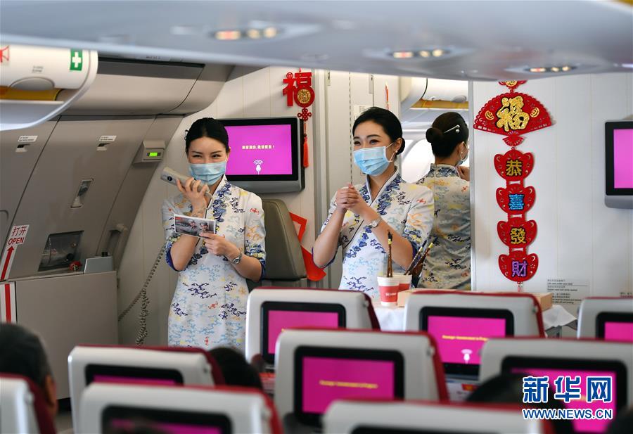 1月24日,空乘人员给乘客拜年。 当日是除夕,在海口飞往北京的海南航空HU7181航班上,坚守工作岗位的机组人员与乘客一起互动,共度佳节。 新华社记者 郭程 摄
