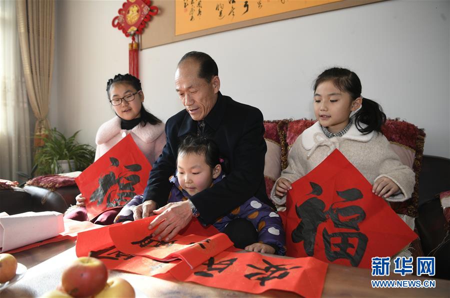 1月24日,谢兴昌(中)与孙女一起准备贴春联。 新华社记者 王鹏 摄