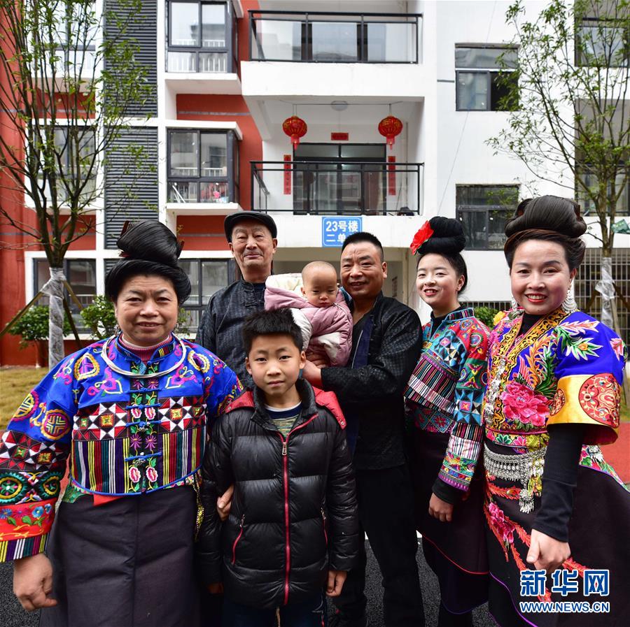 1月24日,在丹寨县易地搬迁安置点金钟社区,杨庆国(右三)一家在新居楼下合影。 除夕当天,在贵州省黔东南苗族侗族自治州丹寨县易地搬迁安置点金钟社区,苗族同胞杨庆国全家首次在新居过年。全家围坐在一起吃团圆饭、话家常,其乐融融。2019年,杨庆国一家从丹寨县龙泉镇卡拉村搬迁至金钟社区,杨庆国就近务工,妻子潘华凤在社区就业,全家顺利脱贫。 新华社发(杨武魁 摄)