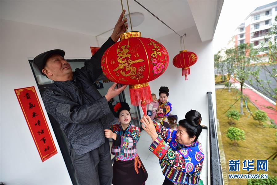 1月24日,在丹寨县易地搬迁安置点金钟社区,杨庆国的父亲杨杰山(左一)和家人一起挂灯笼。 除夕当天,在贵州省黔东南苗族侗族自治州丹寨县易地搬迁安置点金钟社区,苗族同胞杨庆国全家首次在新居过年。全家围坐在一起吃团圆饭、话家常,其乐融融。2019年,杨庆国一家从丹寨县龙泉镇卡拉村搬迁至金钟社区,杨庆国就近务工,妻子潘华凤在社区就业,全家顺利脱贫。 新华社发(杨武魁 摄)