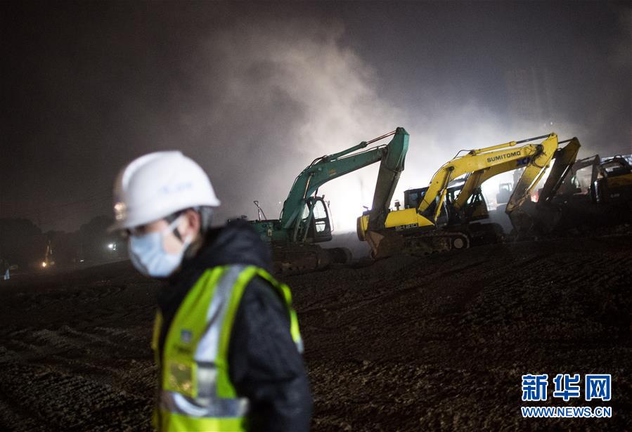 1月24日拍摄的武汉火神山医院建设工地现场。 除夕夜,武汉火神山医院建设工地灯火通明,建设团队放弃与家人团聚,加紧建设这座专门医院。 武汉市参照2003年抗击非典期间北京小汤山医院模式,正在蔡甸区建设的专门医院正式命名为火神山医院。新医院计划于2月3日建成,集中收治新型冠状病毒感染的肺炎患者。 新华社记者 肖艺九 摄