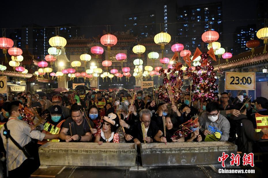 1月24日大年三十晚,香港黄大仙祠有大批善信按照传统习俗上“头炷香”。晚上11时踏入子时,大批善信们争先上头炷香迎接大年初一,部份善信更以老鼠造型打扮迎接鼠年,场面热闹。中新社记者 麦尚旻 摄