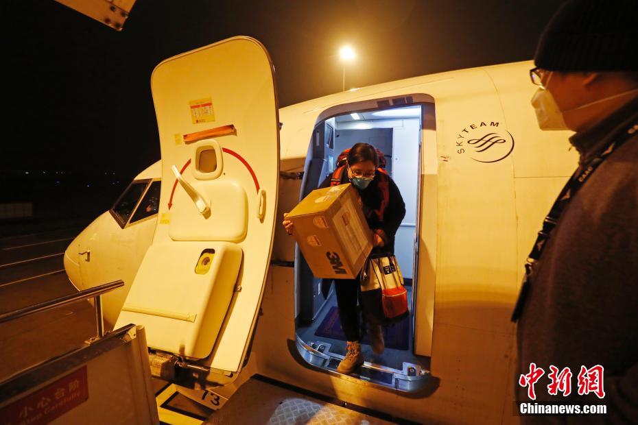 1月25日凌晨1时25分,大年初一,来自上海市28家市级医院和5个区近30家医院的136名医护人员,乘坐东航包机MU5000航班平安降落在武汉天河机场,支援湖北抗击新型肺炎。该航班也是民航首批执行驰援武汉任务的包机航班。图为医护人员携带医疗物资抵达武汉。中新社记者 殷立勤 摄
