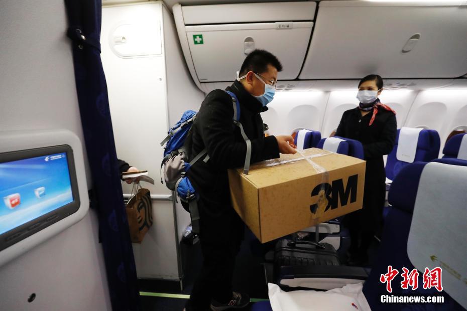 1月25日凌晨1时25分,大年初一,来自上海市28家市级医院和5个区近30家医院的136名医护人员,乘坐东航包机MU5000航班平安降落在武汉天河机场,支援湖北抗击新型肺炎。该航班也是民航首批执行驰援武汉任务的包机航班。图为医护人员携带医疗物品登机。中新社记者 殷立勤 摄