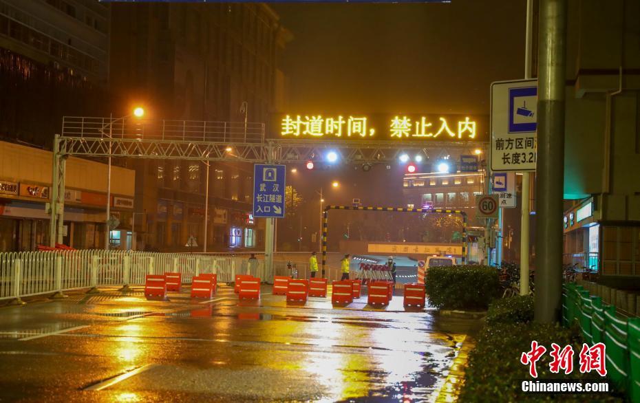 1月25日零时,武汉京汉大道大智路口长江隧道入口方向车道已封闭。武汉市新型肺炎防控指挥部24日发布通告称,自2020年1月25日0时起,过江隧道关闭,三环内(含三环)过江桥梁通行实施体温检测管控。取消时间另行通告。中新社记者 张畅 摄