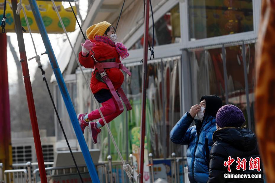 北京龙潭公园内,游客佩戴口罩游玩。中新社记者 韩海丹 摄