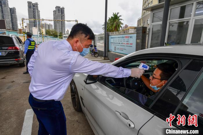 图为海口港的工作人员对进岛自驾车旅客逐一进行体温检测。 骆云飞 摄