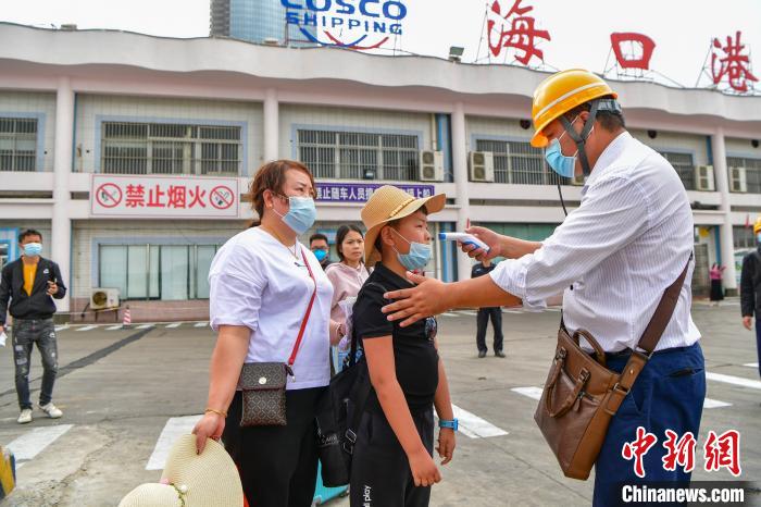 图为海口港工作人员对出岛自驾旅客进行登船前体温检测。 骆云飞 摄