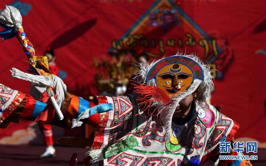 1月25日,演员在表演藏戏。 大年初一,拉萨市堆龙德庆区的群众相聚一起,唱歌跳舞,共庆新春佳节。 新华社记者 觉果 摄