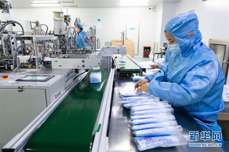1月26日,湖南临澧经济开发区湖南永康医疗器械有限公司员工在码放制作好的口罩。 新华社发(陈思汗摄)