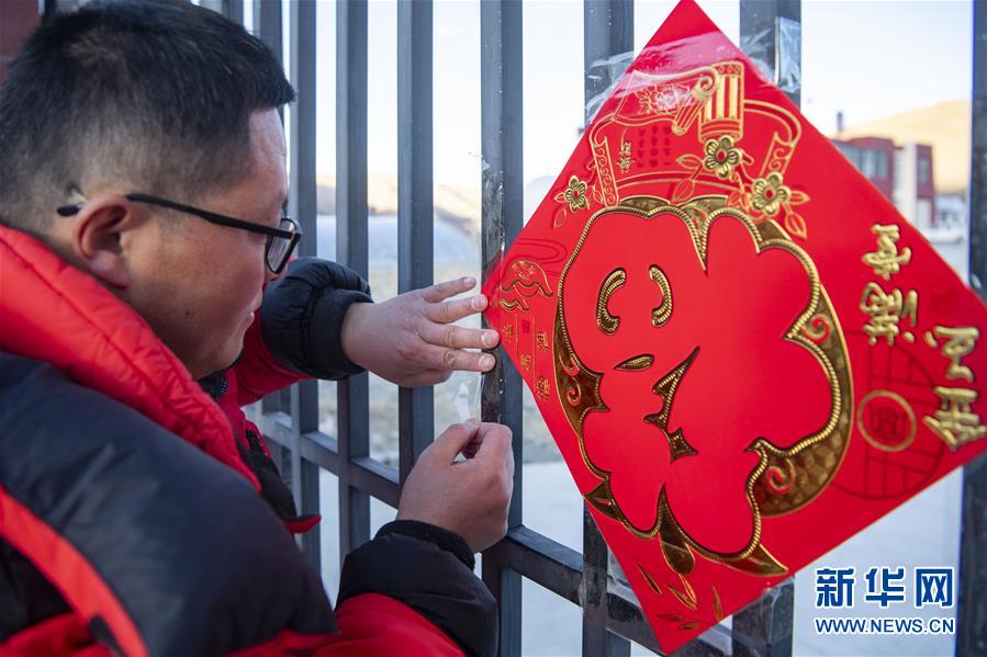 席振华在观测站的大门上贴福字(1月24日摄)。新华社记者 孙非 摄