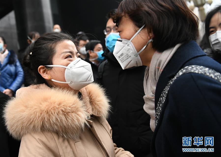 1月26日,来自西安交通大学第一附属医院的陕西省医疗队队员(左)与同事道别。 当日,陕西省援助湖北应对新型冠状病毒感染的肺炎疫情医疗队从西安出发。来自陕西省51家医疗机构的136名医疗队员前往武汉支援疫情救治工作。 新华社记者 李一博 摄