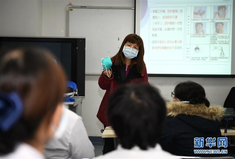 1月25日,在西安交通大学第二附属医院,来自该院的医疗队员在出发前接受培训。 1月26日,陕西省援助湖北应对新型冠状病毒感染的肺炎疫情医疗队从西安出发。来自陕西省51家医疗机构的136名医疗队员前往武汉支援疫情救治工作。 新华社记者 李一博 摄