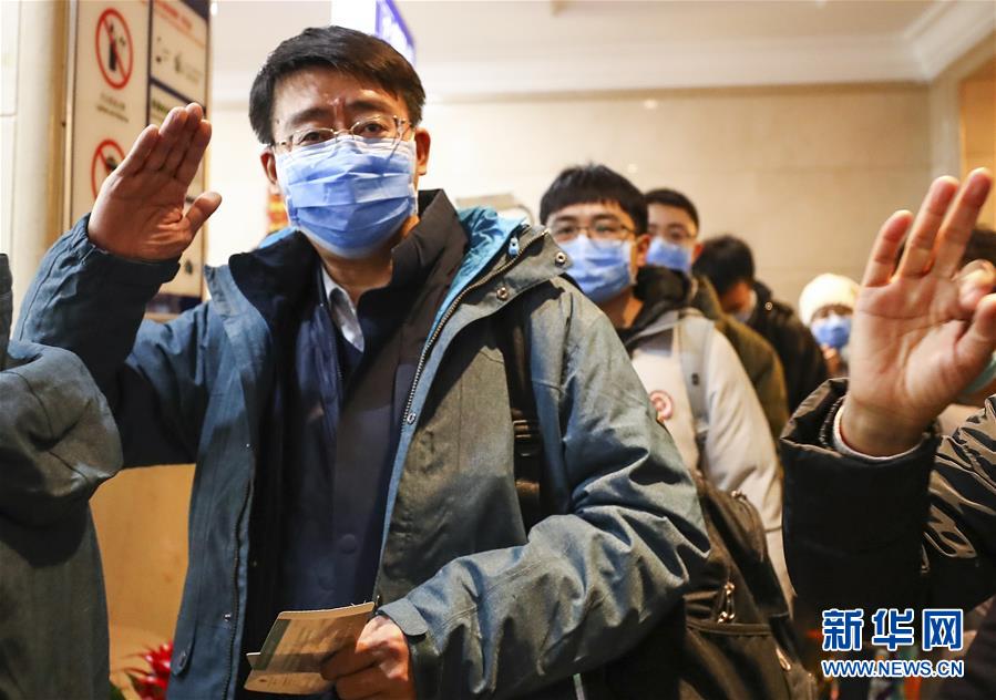 1月26日,国家援鄂抗疫医疗队队员们在首都机场准备登机。 国家卫生健康委员会从北京医院、中国医学科学院北京协和医院、中日友好医院、北京大学第一医院、北京大学人民医院、北京大学第三医院6家在京委属委管医院,抽调重症医学科、呼吸科、医院感染科专家共121人,组建国家援鄂抗疫医疗队,于1月26日下午飞赴武汉。 新华社记者 张玉薇 摄