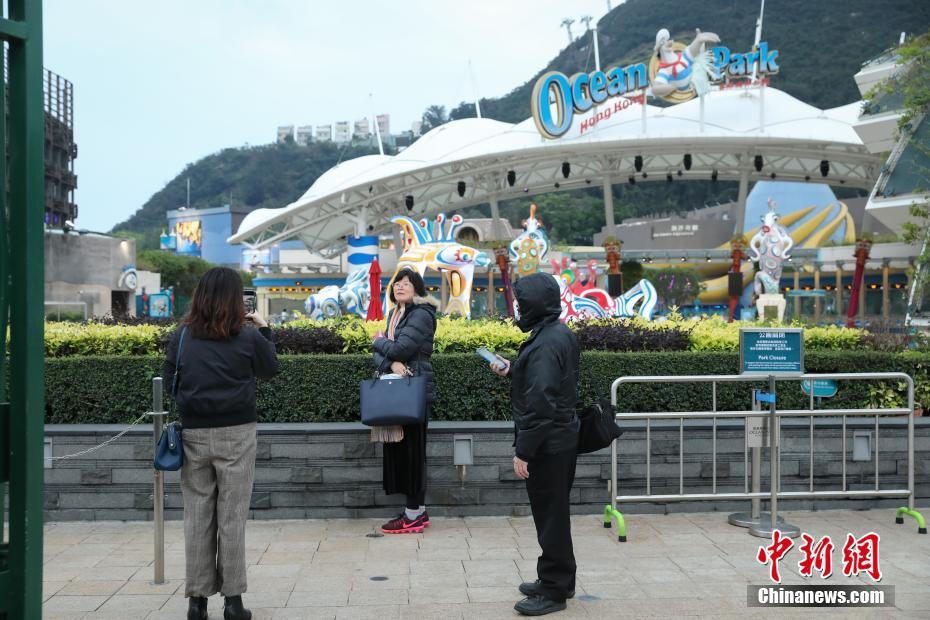 1月26日,香港海洋公园宣布,鉴于新型冠状病毒肺炎之应变级别已提升至紧急级别,考虑到访客及员工安全,宣布暂停开放至另行通知。图为有游客到场发现公园关闭,只能在大门外拍照。中新社记者 谢光磊 摄