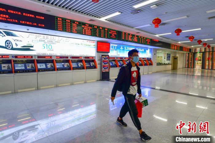 图为佩戴口罩的旅客行走在空荡荡的售票大厅。 骆云飞 摄