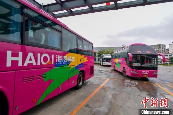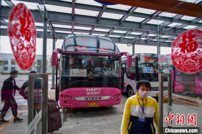 图为一辆长途大巴车离开海口长途客运总站。 骆云飞 摄