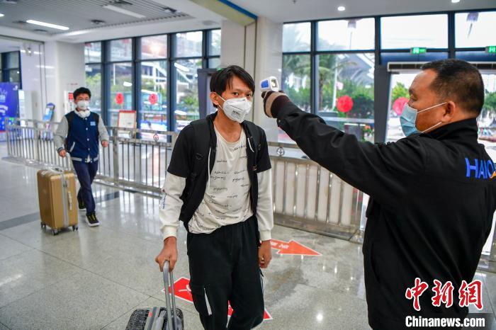 图为海口长途客运总站的工作人员对进站旅客逐一进行体温检测。 骆云飞 摄