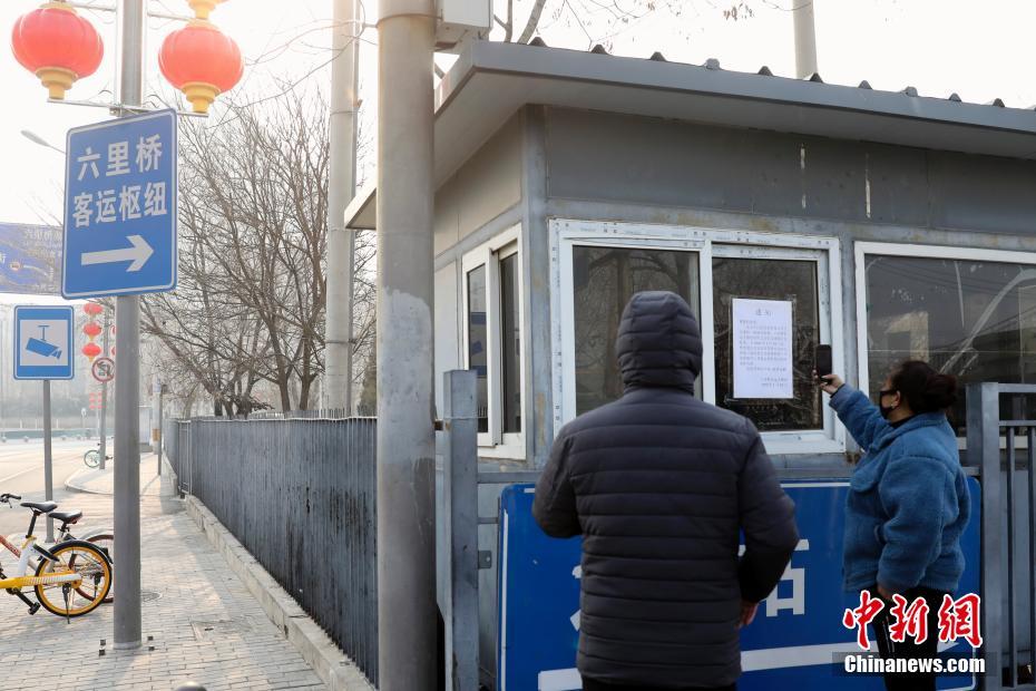 1月26日,市民在北京六里桥客运主枢纽的进站口观看“停运”通知。北京市交通委26日发布消息,为严控新型冠状病毒通过道路客运传播,从1月26日起,除政府指定及疫情防控工作需要,暂停进出北京的经营性长途客运班线(不含跨市运营的地面公交线路)和旅游包车,恢复时间另行通知。乘客可免费退票。中新社记者 盛佳鹏 摄
