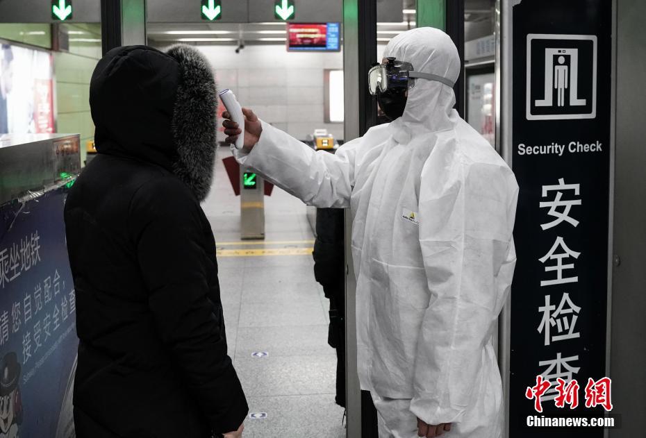 1月26日,工作人员在北京陶然亭地铁站对进站乘客测量体温。北京市地铁自1月24日首班车起,陆续在北京西站、北京站、首都机场、北京南站、西单站等50余座车站,由专人穿戴防护服对进站乘客体温进行测试。中新社记者 崔楠 摄