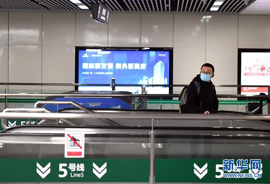 1月26日,一乘客佩戴口罩在郑州地铁5号线一车站内。 记者从郑州地铁了解到,为进一步加强新型肺炎疫情防控工作,1月26日起,乘客进站乘坐地铁时必须佩戴口罩,否则车站工作人员将予以阻止劝离。 新华社记者 李嘉南 摄