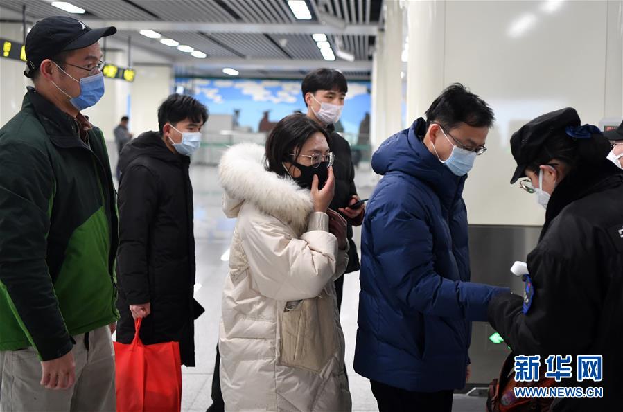 1月26日,乘客在郑州地铁5号线一车站安检处排队测量体温。 记者从郑州地铁了解到,为进一步加强新型肺炎疫情防控工作,1月26日起,乘客进站乘坐地铁时必须佩戴口罩,否则车站工作人员将予以阻止劝离。 新华社记者 李嘉南 摄