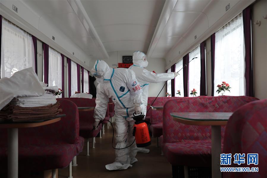 1月26日,中国铁路兰州局集团有限公司疾控所工作人员在列车车厢内进行消毒工作。新华社发(杜哲宇 摄)