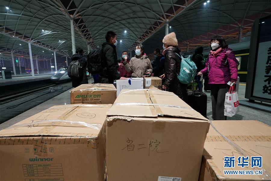 1月26日,河北省第一批赴鄂抗疫医疗队队员在石家庄火车站站台准备乘车。新华社记者 牟宇 摄