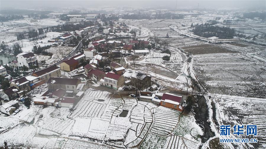 1月27日拍摄的舒城县雪后田野与农舍(无人机照片)。 一夜之间,鼠年的第一场大雪将安徽省舒城县装点成一片洁白的世界,广袤的田野呈现出千姿百态的线条,犹如一幅展开的锦绣画卷。 新华社记者 陶明 摄