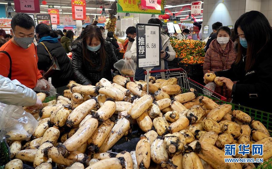 1月27日,市民在西安市太华路十字一家大型超市内采购。 近日,为保障疫情防控期间居民生活必需品的供应,陕西省西安市加大市场供应力度,目前已储备蔬菜2万余吨,猪肉1500余吨,可随时投入市场,同时安排西安各商贸企业加大基本生活必需品采购力度,满足市场供应。 新华社记者 刘潇摄