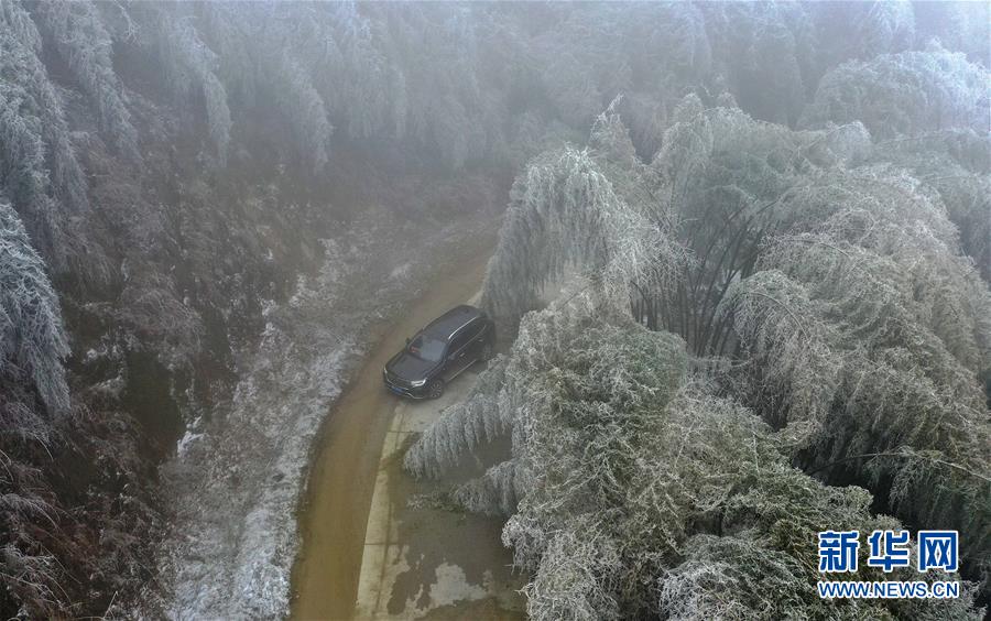 在广西融水苗族自治县杆洞乡高强村,道路两旁的竹子被冰雪压弯(1月27日无人机照片)。 1月26日起,受强冷空气影响,广西融水苗族自治县高寒山区出现冰雪天气,当地气象部门于26日发布道路结冰黄色预警,提醒群众做好防范。 新华社记者 黄孝邦 摄