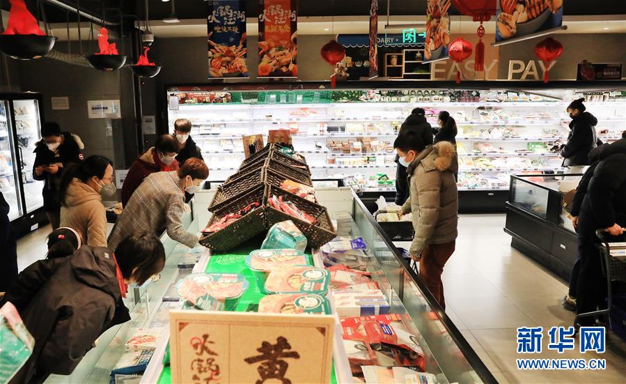 1月27日,市民在上海一家超市内选购食品。 近日,在上海,食品电商平台送货上门服务需求量大,电商外送开足马力,传统菜市场照常开门迎客,保证节日农副食品供应充足有序。 新华社记者 方喆 摄