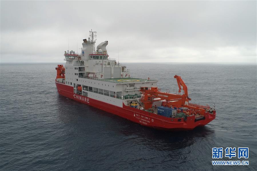 1月27日,“雪龙2”号在南大西洋的西风带进行科考作业(无人机照片)。新华社记者 刘诗平 摄