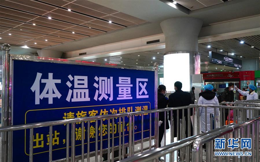 1月29日,南昌西站工作人员在为旅客测量体温。 近日,各地采取多种措施,加强对新型冠状病毒感染的肺炎疫情防控。 新华社记者 胡晨欢摄