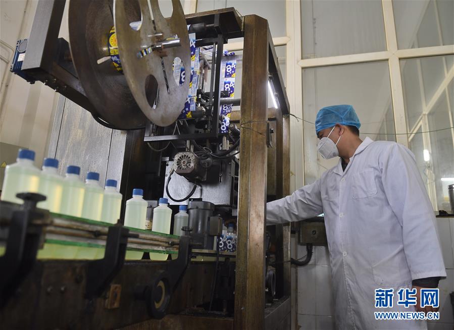 1月29日,成都一家公司工人在消毒液生产车间作业。该公司目前满负荷生产消毒用品,供应市场。 近日,各地采取多种措施,加强对新型冠状病毒感染的肺炎疫情防控。 新华社记者刘坤摄