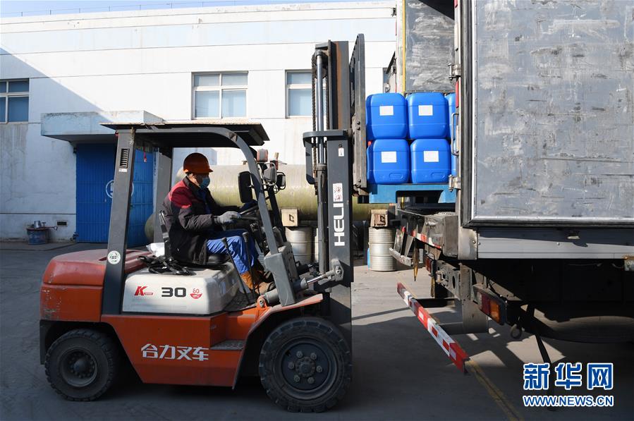 1月29日,在兰州一家公司,工作人员使用叉车将罐装好的过氧乙酸消毒溶液产品装车。该公司近日抽调专业技术人员,组织原料,加班组织生产过氧乙酸消毒溶液,保障市场供应。 近日,各地采取多种措施,加强对新型冠状病毒感染的肺炎疫情防控。 新华社记者刘坤摄